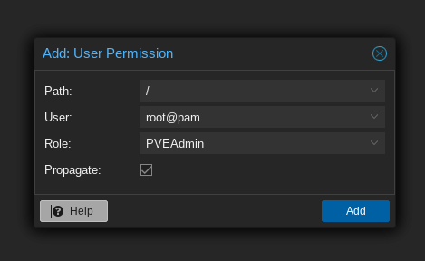 Navigate to Datacenter > API Tokens > Permission > Add role ‘PVEVMAdmin’.